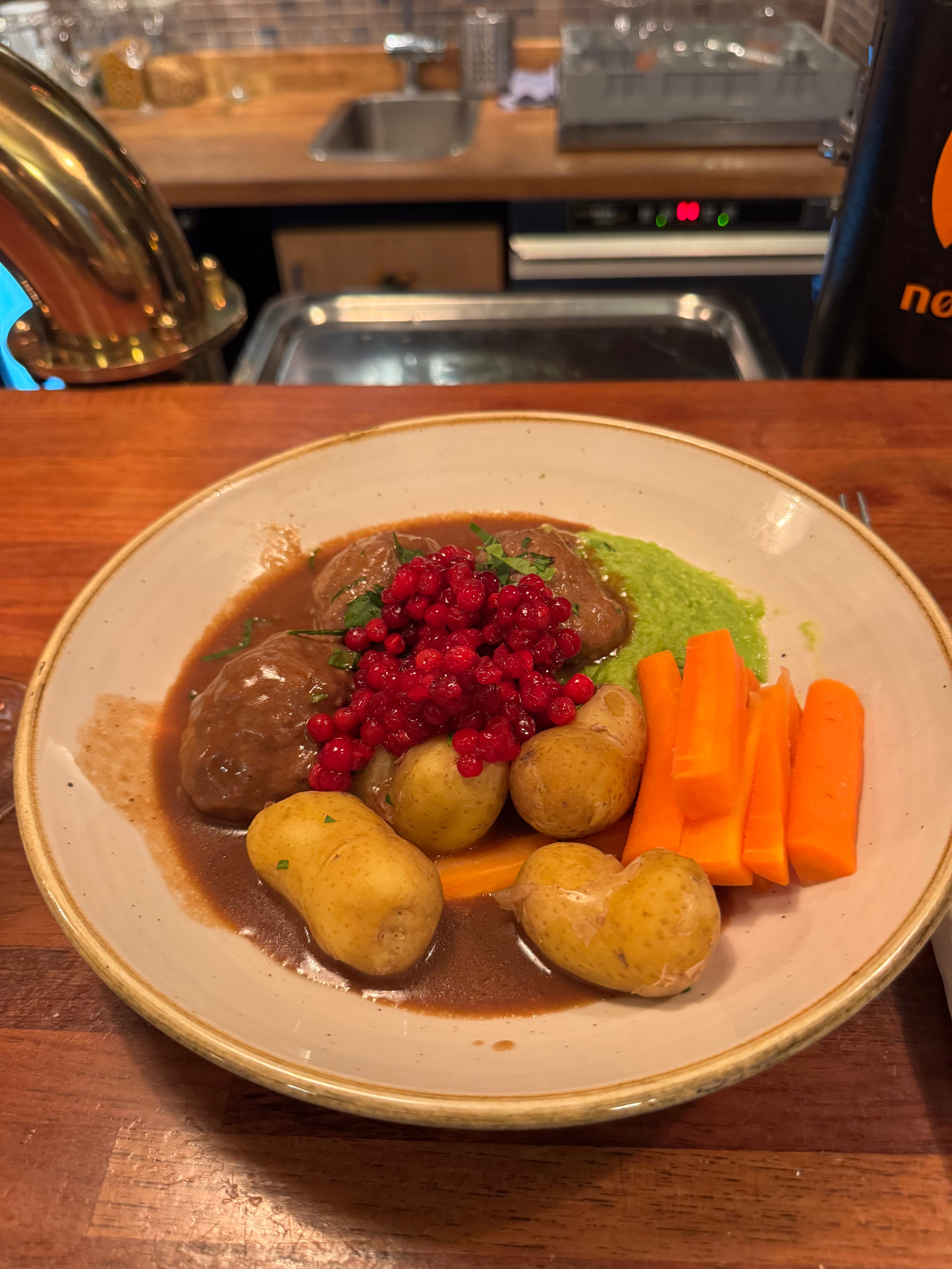 my first dinner in Bergen, Norway, which did a disservice to the trope that Ikea is indeed an accurate representation of what Scandinavia is actually like. This bowl of meatballs with gravy, mushy peas, and lingonberries was from Pingvinen, a cozy pub serving traditional Norwegian dishes (mom had fish soup).