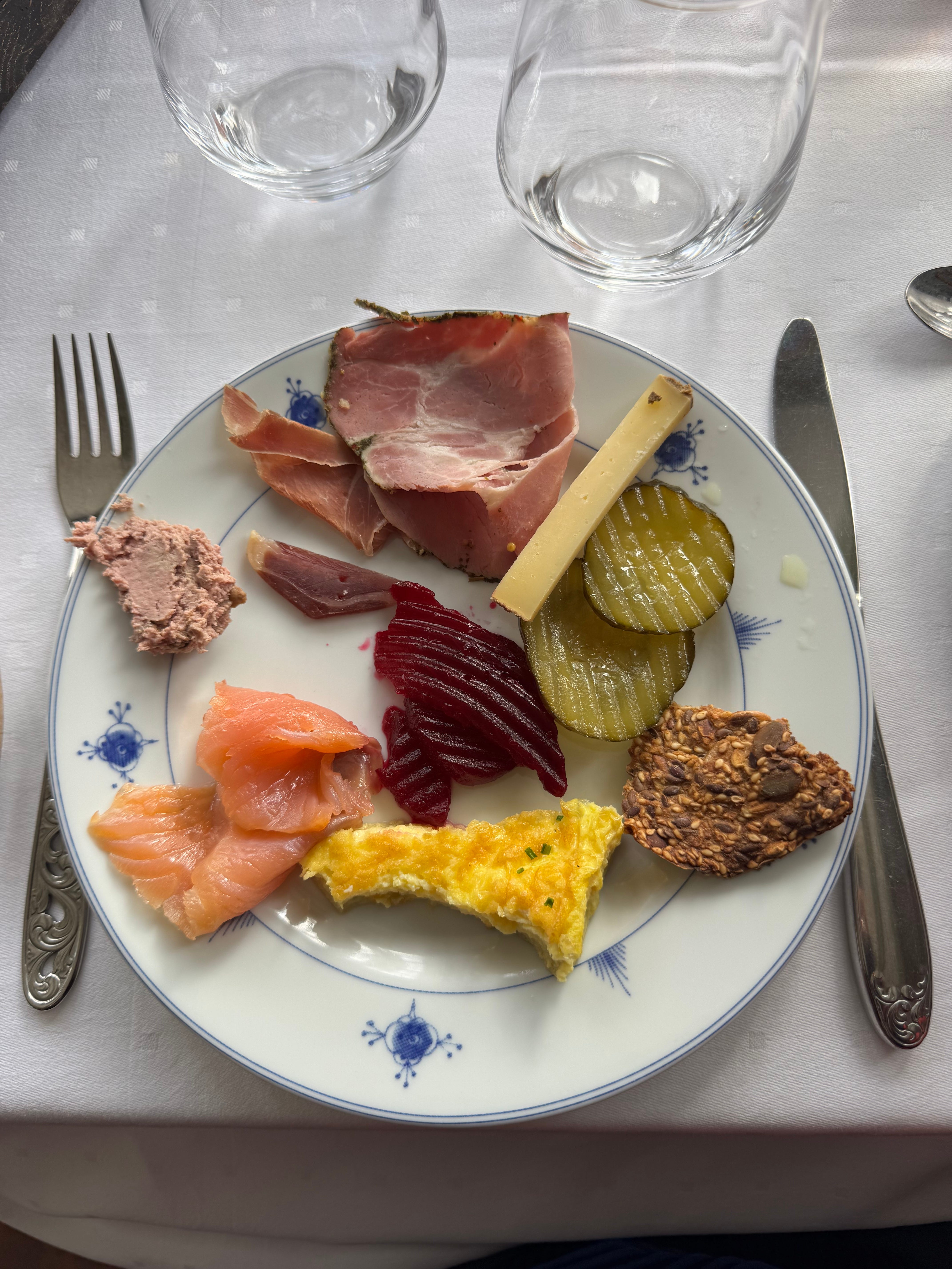 a salty Norwegian hotel breakfast - cured meats, liver pâté, cheese, smoked salmon, sliced beets, pickles, omelette, and seeded cracker.