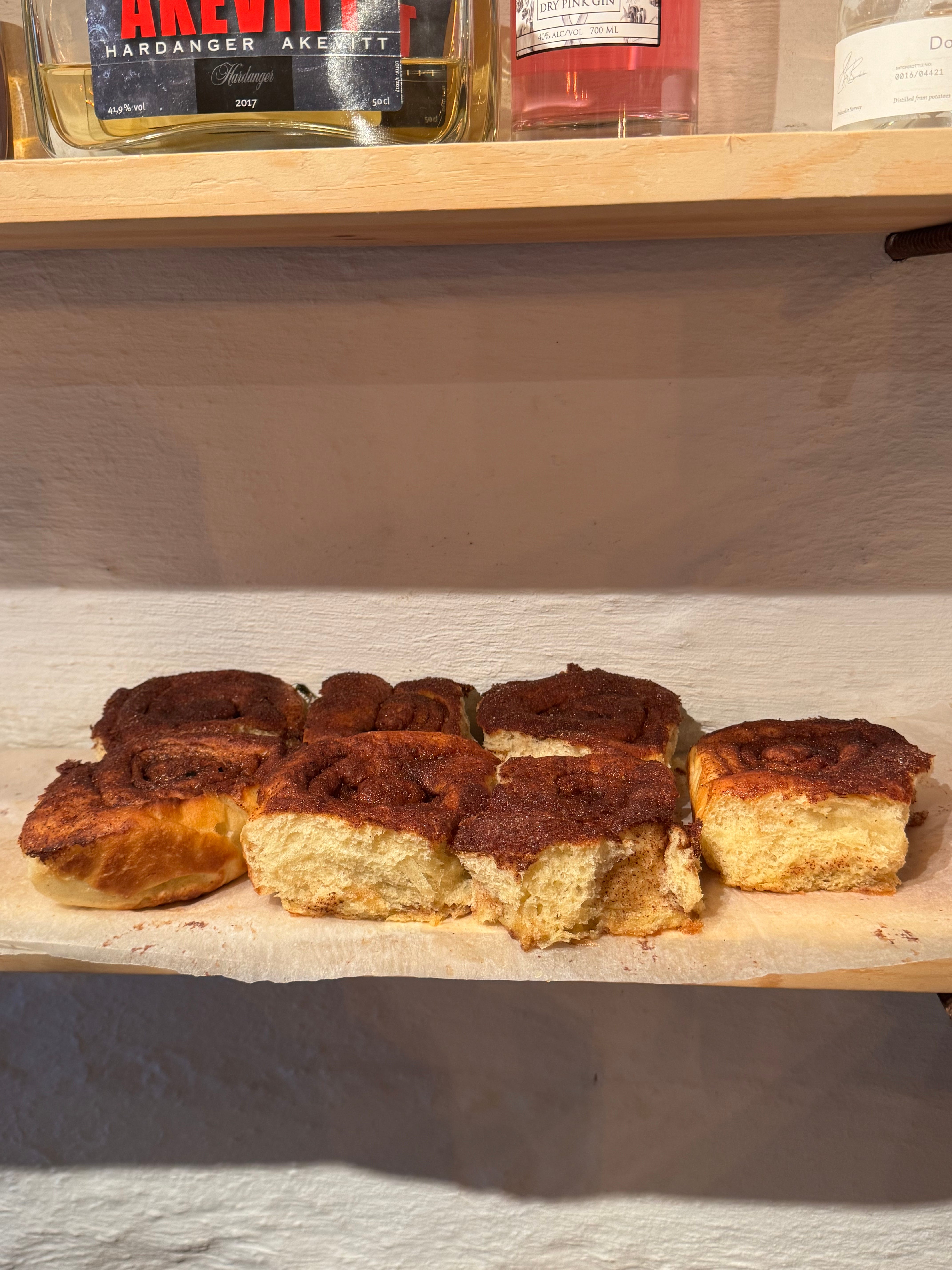 fluffy cinnamon buns nestled on the shelf in Spildegarden, a small cafe we visited for our final lunch. the fish soup was excellent.