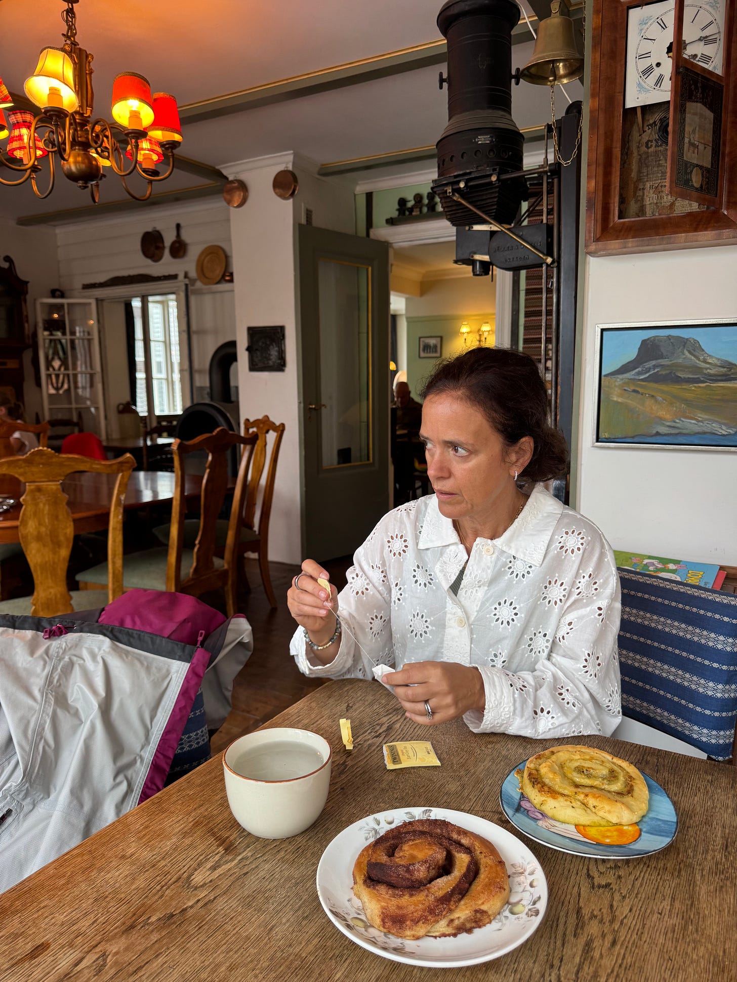 munching on a cinnamon roll and a pesto roll from Fløy Bakeri in Lofthus after dropping off our bags.